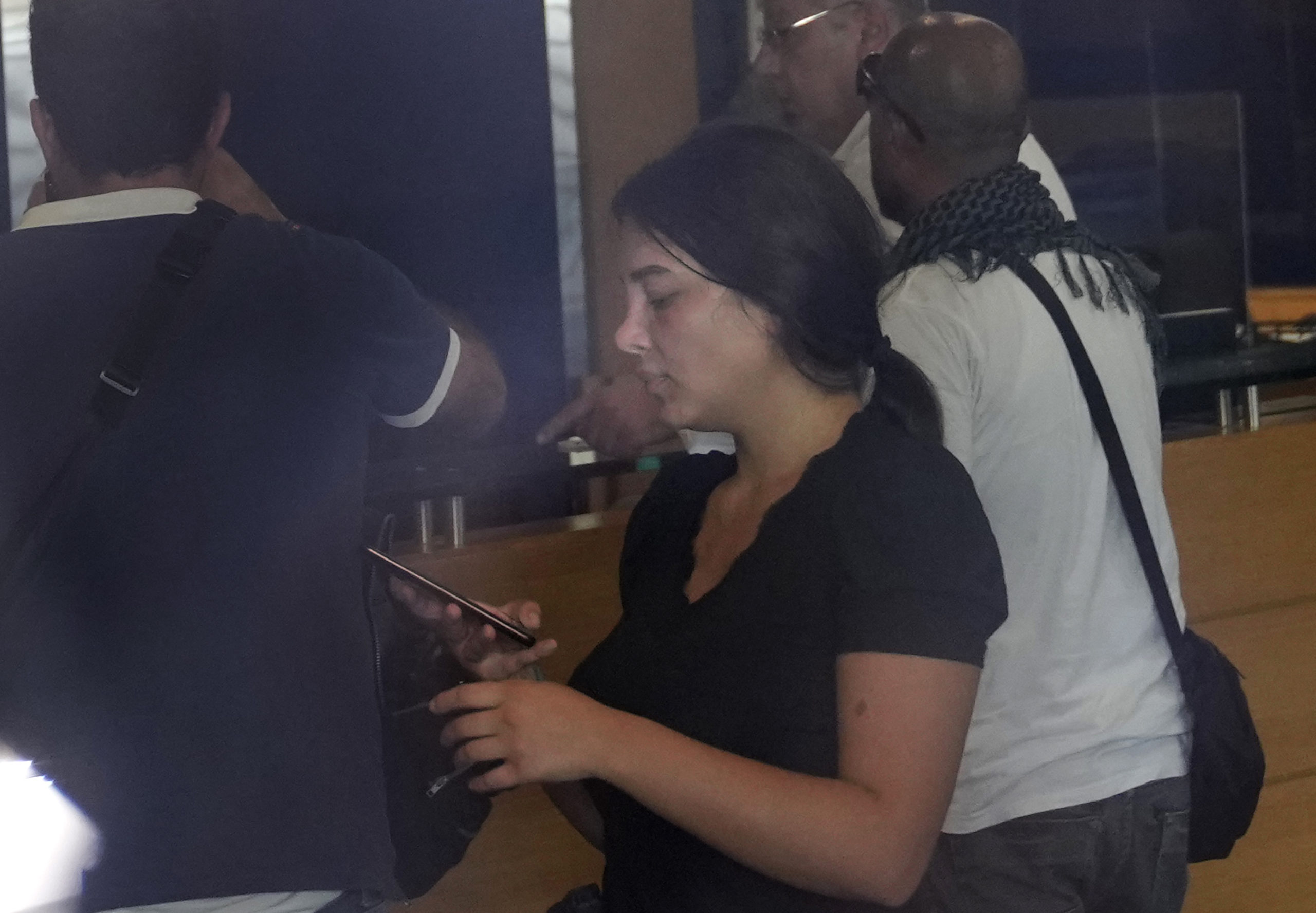 Lebanese Sali Hafez, center, accompanied by activists looks at her phone after breaking into a BLOM Bank branch brandishing what she later said was a toy pistol and taking $13,000 from her trapped savings accopunt, in Beirut, Lebanon, Wednesday, Sept. 14, 2022. Lebanon's cash-strapped banks have imposed strict limits on withdrawals of foreign currency since 2019, tying up the savings of millions of people. About three-quarters of the population has slipped into poverty as the tiny Mediterranean country's economy continues to spiral. (AP Photo/Hussein Malla)