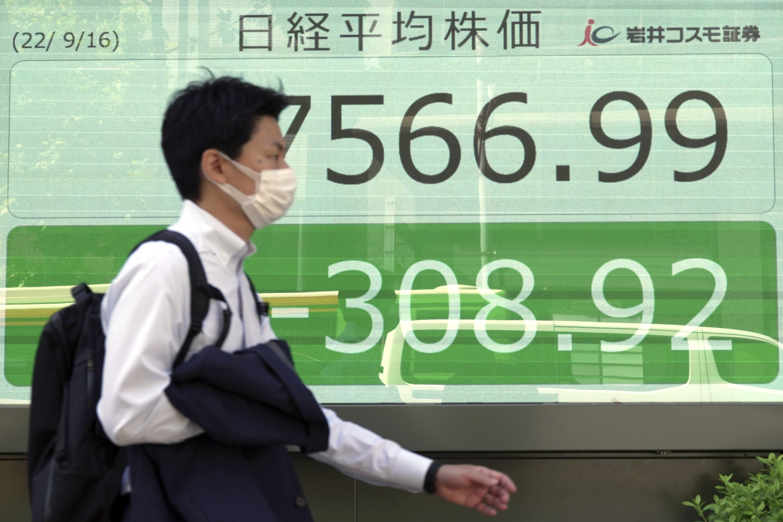 A person wearing a protective mask walks in front of an electronic stock board showing Japan's Nikkei 225 index at a securities firm Friday, Sept. 16, 2022, in Tokyo. Asian stock markets followed Wall Street lower on Friday after higher-than-expected U.S. inflation dashed hopes the Federal Reserve might ease off more interest rate hikes. (AP Photo/Eugene Hoshiko)