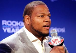 FILE PHOTO: Ndamukong Suh of the Detroit Lions speaks after he received the Pepsi NFL Rookie of the Year award at a news conference in Dallas, Texas, February 3, 2011. REUTERS/Mike Stone