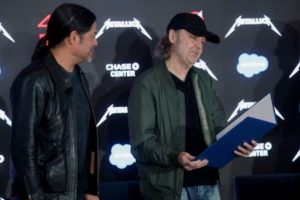 FILE PHOTO: Metallica bass player Robert Trujillo and drummer Lars Ulrich hold a proclamation declaring “Metallica Day” in San Francisco, California, U.S. December 16, 2021. REUTERS/Nathan Frandino/File Photo