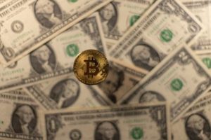 Representation of virtual cryptocurrency Bitcoin is placed on U.S. Dollar banknotes in this illustration taken November 28, 2021. REUTERS/Dado Ruvic/Illustration