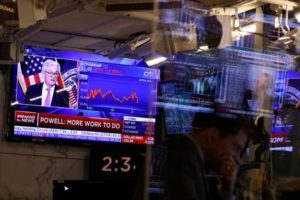 FILE PHOTO: Federal Reserve Board Chairman Jerome Powell appears on a screen on the trading floor of the New York Stock Exchange (NYSE) during a news conference following a Fed rate announcement, in New York City, U.S., February 1, 2023. REUTERS/Andrew Kelly/File Photo