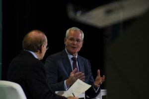 FILE PHOTO: Darren Woods, the chairman and CEO of Exxon Mobil Corporation, speaks with Daniel Yergin, the vice chairman of S&P Global, during the CERAWeek energy conference in Houston, Texas, U.S., March 7, 2023. REUTERS/Callaghan O’Hare