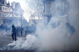 Masked protesters react amid tear gas during clashes in front of Paris city hall at a demonstration as part of the 12th day of nationwide strikes and protests against French government’s pension reform, in Paris, France, April 13, 2023. REUTERS/Stephane Mahe