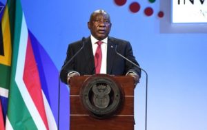 South Africa’s President Cyril Ramaphosa looks on as he delivers the opening address at the 5th Investment Conference to showcase opportunities available in the country to local and international companies, in Sandton, South Africa, April 13, 2023. Jairus Mmutle/Government Communication Information System (GCIS)/Handout via REUTERS