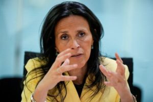 FILE PHOTO: French Minister for development Chrysoula Zacharopoulou speaks to the media at the International Monetary Fund Building, in Washington, D.C., U.S. April 12, 2023. REUTERS/Ken Cedeno