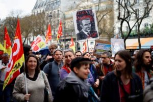 Protesters hold French labour union CGT flags and a placard with a drawing depicting a portrait of French President Emmanuel Macron during a demonstration as part of the 12th day of nationwide strikes and protests against French government’s pension reform, in Paris, France, April 13, 2023. REUTERS/Sarah Meyssonnier/File Photo