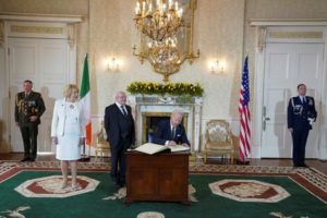 U.S. President Joe Biden signs the guest book, as he meets with Irish President Michael Higgins and his wife Sabina Coyne, in Dublin, Ireland, April 13, 2023. REUTERS/Kevin Lamarque