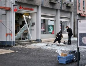 Law enforcement officers investigate the scene following an attack on bank ATMs in Ratingen, Germany, March 15, 2023. Courtesy of Achim Blazy/Handout via REUTERS
