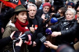 French CGT labour union leader Sophie Binet talks to journalists during a demonstration in front of the Paris City Hall after the Constitutional Council (Conseil Constitutionnel) approved most of the French government’s pension reform, in Paris, France, April 14, 2023. REUTERS/Stephane Mahe