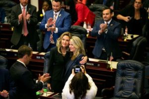 Florida state Rep. Jennifer Canady hugs Rep. Jenna Persons-Mulicka after the House passed SB 300, which bans abortions after six weeks in Florida, in Tallahassee, Florida, U.S. April 13, 2023. Alicia Devine/USA Today Network via REUTERS