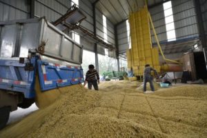 FILE PHOTO: Workers are seen next to a truck unloading harvested soybeans at a farm in Chiping county, Shandong province, China October 8, 2018. Picture taken October 8, 2018. REUTERS/Stringer/File Photo