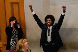 Democratic Tennessee state Representative Justin Pearson, who was ousted from the Tennessee House of Representatives along with another young Black colleague for breaking decorum with a gun control demonstration on the House floor, reacts as he returns to the state legislature after being reinstated in Nashville, Tennessee, U.S. April 13, 2023. REUTERS/Cheney Orr