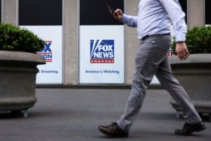 FILE PHOTO: A person walks by Fox News signage posted on the News Corporation building in New York City, U.S. April 12, 2023 REUTERS/Andrew Kelly/File Photo