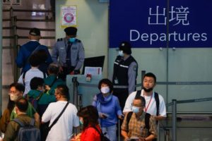 People line up to pass the departures gate as China’s no fly and no shipping zone comes into force in East China Sea to the north of Taiwan at Taoyuan International airport in Taoyuan, Taiwan April 16, 2023. REUTERS/Ann Wang