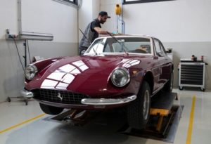 A man works on a Ferrari Classiche car at the Atelier Fiorano, a Rossocorsa authorised bodyshop in Assago near Milan, Italy, April 6, 2023. REUTERS/Alessandro Garofalo
