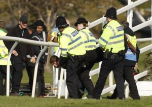 Horse Racing – Grand National Festival 2023 – Aintree Racecourse, Liverpool, Britain – April 15, 2023 A animal rights activist is detained by the police at Aintree Racecourse REUTERS/Jason Cairnduff