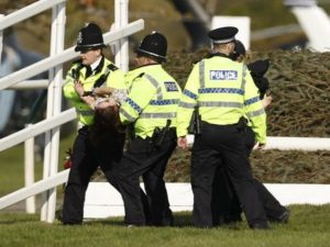 Horse Racing – Grand National Festival 2023 – Aintree Racecourse, Liverpool, Britain – April 15, 2023 An animal rights activist is apprehended by police officers at Aintree Racecourse as the start of the 17:15 Randox Grand National Handicap Chase is delayed REUTERS/Jason Cairnduff