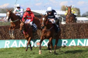 Horse Racing – Grand National Festival 2023 – Aintree Racecourse, Liverpool, Britain – April 15, 2023 Handsworth ridden by L P Dempsey and Kapga De Lily ridden by Charlie Deutsch in action during the 16:15 William Hill Handicap Chase REUTERS/Phil Noble