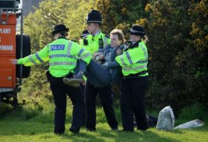 Horse Racing – Grand National Festival 2023 – Aintree Racecourse, Liverpool, Britain – April 15, 2023 A detained animal rights activist is carried by police officers at Aintree Racecourse REUTERS/Phil Noble
