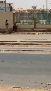 Two armed men seen on a street in Kartoum, Sudan April 15, 2023, in this scren grab obtained from a social media video. Mohammadkhair Abdualrhman/via REUTERS