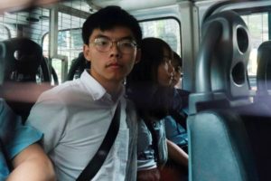 FILE PHOTO: Pro-democracy activists Joshua Wong and Agnes Chow arrive at the Eastern Court in a police van, after being arrested on suspicion for organising illegal protests, in Hong Kong, China August 30, 2019. REUTERS/Tyrone Siu/File Photo