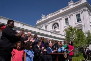U.S. President Joe Biden signs an executive order on childcare and eldercare costs during an event in the Rose Garden at the White House in Washington, U.S., April 18, 2023. REUTERS/Nathan Howard