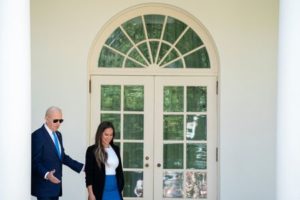 U.S. President Joe Biden and Kezia Rodriguez, a mother and nursing student, arrive to deliver remarks on childcare and eldercare costs during an event in the Rose Garden at the White House in Washington, U.S., April 18, 2023. REUTERS/Nathan Howard