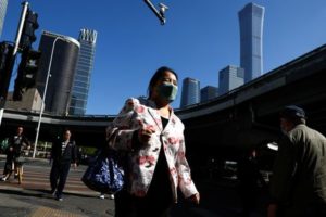 FILE PHOTO: A woman walks past a street at the Beijing’s Central Business District (CBD) during morning rush hour, in Beijing, China April 18, 2023. REUTERS/Tingshu Wang