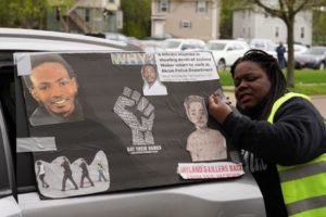 A person puts up a poster on a car during a protest held a day after a grand jury voted against indicting police officers in the fatal shooting of unarmed Black man Jayland Walker, in Akron, Ohio, U.S. April 18, 2023. REUTERS/Dieu-Nalio Chery