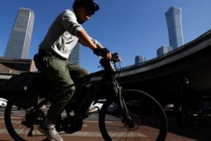 FILE PHOTO: A man rides a bicycle past a street at the Beijing’s Central Business District (CBD) during morning rush hour, in Beijing, China April 18, 2023. REUTERS/Tingshu Wang