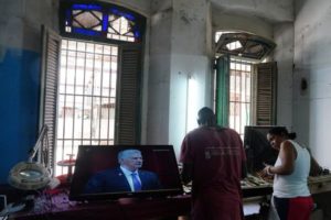 People talk in an electrical repair shop as Cuba’s President and First Secretary of the Communist Party Miguel Diaz-Canel, seen live on TV, addresses lawmakers after being re-elected during a National Assembly session in Havana, Cuba, April 19, 2023. REUTERS/Alexandre Meneghini