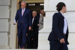 U.S. House Speaker Kevin McCarthy (R-CA) walks through a door alongside his house Republican colleagues, to speak about the Republican party’s first one hundred days of holding the majority in the House of Representatives on Capitol Hill in Washington, U.S., April 17, 2023. REUTERS/Amanda Andrade-Rhoades