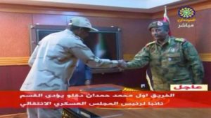 FILE PHOTO: Sudan’s General Abdelfattah Mohamed Hamdan Dagalo, known as “Hemeti”, head of the Rapid Support Forces, is sworn-in as the appointed deputy of Sudan’s transitional military council, standing before the head of transitional council, Lieutenant General Abdel Fattah Al-Burhan Abdelrahman (R) in Khartoum, Sudan April 13, 2019 in this still image taken from video. Sudan TV/ReutersTV via REUTERS