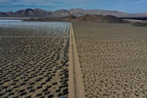FILE PHOTO: Fields of directed heliostat mirrors are seen at the Ivanpah Solar Electric Generating System (left), and photovoltaic solar panels are seen at the Desert Stateline Solar Facility (far right) near Nipton, California U.S., February 27, 2022. Picture taken with a drone on February 27, 2022. REUTERS/Bing Guan/File Photo