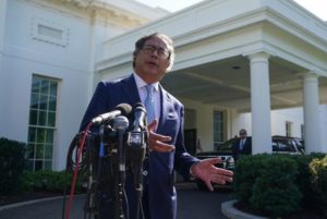 Colombian President Gustavo Petro speaks to reporters after meeting with U.S. President Joe Biden at the White House in Washington, U.S., April 20, 2023. REUTERS/Kevin Lamarque
