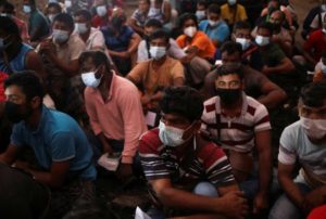 FILE PHOTO: Migrant workers gather at the compound of their dormitory for a document check, during a joint operation by the Department of Labour and several other Malaysian government agencies on workers’ living condition and other criteria of forced labour and human trafficking, in Kuala Lumpur, Malaysia, March 17, 2022. REUTERS/Hasnoor Hussain