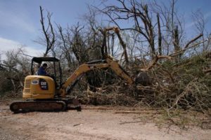 A man uses an excavator to remove fallen trees following overnight tornadoes in Cole, Oklahoma, U.S., April 20, 2023. REUTERS/Nick Oxford