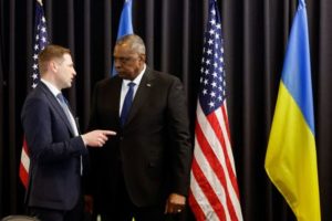 U.S. Secretary of Defense Lloyd Austin speaks with Estonian Minister of Defence Hanno Pevkur as they attend the Fourth Ukraine Defense Contact group meeting at Ramstein U.S. Air Base, Germany, April 21, 2023. REUTERS/Heiko Becker
