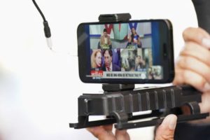 A media member streams their news desk on their phone screen while reporting outside Robert F. Peckham Federal Building and U.S. Courthouse on the day Peru’s former President Alejandro Toledo, wanted in his home country on charges of taking millions of dollars in bribes, is expected to turn himself in for extradition, in San Jose, California, U.S. April 21, 2023. REUTERS/Loren Elliott