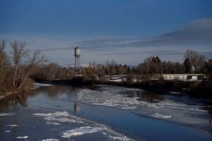 A water tower is reflected in icy water in Missoula, Montana, U.S. February 25, 2023. Montana is a largely rural state and 25% of Blue Mountain Clinic’s clients travel 50 miles or more to receive their care. REUTERS/Callaghan O’Hare