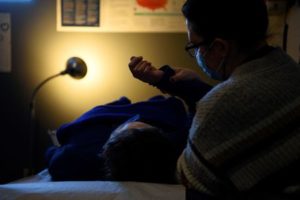 Dr. Blau attends to Abigail Carey, 43, during an Osteopathic Manipulative Therapy appointment at Blue Mountain Clinic in Missoula, Montana, U.S. February 24, 2023. Carey has Myalgic Encephalomyelitis and Fibromyalgia, a combination that affects her energy levels and often makes everyday activities more challenging. To manage her pain, she has regular OMT appointments. “OMT helps release some of the tension and the pain and holding patterns”, Carey said. “It’s so subtle and gentle, but I love that it’s sort of hands on.” REUTERS/Callaghan O’Hare