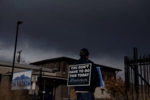 A protester wears a sign discouraging abortion as patients receive care at Blue Mountain Clinic in Missoula, Montana, U.S. February 28, 2023. Blue Mountain Clinic began as a feminist health collective in 1977 and was the first abortion provider in the state of Montana. In 1991, the clinic expanded its scope beyond reproductive medicine and began offering everything from early infant care to end of life care. Blue Mountain Clinic also provides gender affirming care, mental health therapy and substance abuse treatment. “Anybody can walk through the door for anything”, Nicole Smith, Blue Mountain Clinic’s executive director said. “[Patients] could be coming in here for a vaccine or a well child visit or following up on cancer treatment.” REUTERS/Callaghan O’Hare