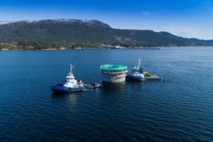 Spar structures of the Hywind Tampen floating wind farm are being moved to Dommersnes from Aker Solutions site in Stord, Norway, April 18, 2021. Jan Arne Wold Equinor/Handout via REUTERS