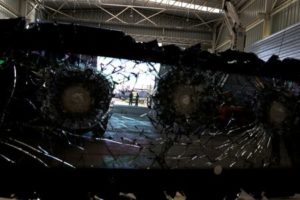 Workers of a vehicle bulletproofing workshop are seen through a car bulletproof glass sample in Santiago, Chile, April 20, 2023. REUTERS/Ivan Alvarado