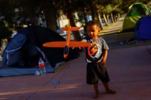 Jesuar, 3, a migrant boy born in Colombia and traveling with his Venezuelan parents, plays while camping near the immigration detention center where 40 migrants died during a fire, in Ciudad Juarez, Mexico April 24, 2023. REUTERS/Jose Luis Gonzalez