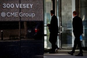 FILE PHOTO: Men enter the CME Group offices in New York, U.S., October 18, 2017. REUTERS/Brendan McDermid/File Photo