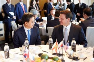 Florida’s Governor Ron DeSantis talks with South Korea’s Gyeonggi Province Governor Kim Dong-yeon during their meeting in Seoul, South Korea, April 26, 2023. Gyeonggi Province/Yonhap via REUTERS