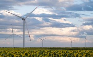 FILE PHOTO: Wind turbines are seen in sunflower field during