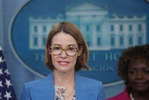 Cast member Leisha Hailey of Showtime’s TV show The L Word speaks about LGBTQIA rights to draw attention to Lesbian Visibility Week during a briefing with White House Press Secretary Karine Jean-Pierre at the White House in Washington, U.S., April 25, 2023. REUTERS/Leah Millis
